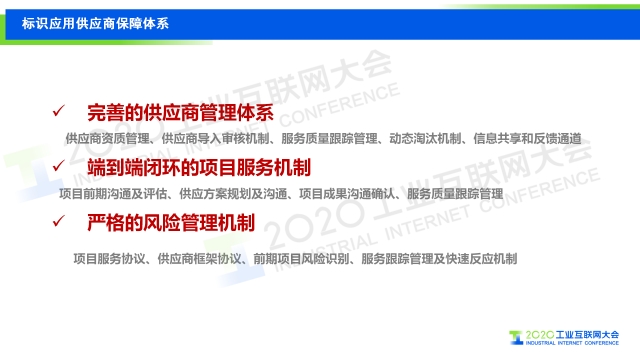 我國工業互聯網標識解析體系正逐步完善,標識應用初具規模。當前,中國信息通信研究院按照標識應用對象的不同層級構建工業互聯網標識應用體系,分析應用價值,能夠引導標識應用向更廣范圍、更大規模、更深層次發展。 中國信息通信研究院正在建立標識應用供應商體系,發揮各供應商應用基礎和優勢,為標識規模化落地提供便捷條件,將從三個方面助力企業快速落地標識應用。一是豐富標識應用體系,形成標識應用產品庫和資源池,不斷完善標識應用體系,提供一體化、多樣化選擇; 二是引導企業快速落地應用,解決企業標識應用落地難,成效差的問題,降低企業對于應用開發的門檻,實現應用快速規模化落地; 三是形成標識應用產業風向標,發揮行業龍頭的優勢和經驗積累,通過行業強實踐性應用,挖掘標識潛在深層價值,明確應用發力點和突破方向,為標識產業決策做支撐。 詳情見以下演講PPT 敬請閱讀 本次發布的工業互聯網標識應用供應商將提供應用產品方案規劃、應用方案設計、應用所需資源測算,標識應用技術支持、系統對接、軟硬件適配,標識應用運營計劃,標識解析應用建議、運營形式、成本審視及規劃等服務。 未來,中國信通院工業互聯網所將與合作伙伴共同構建工業互聯網標識生態,支持標識應用供應商成為綜合解決方案提供商,不斷壯大、完善標識供應商體系。