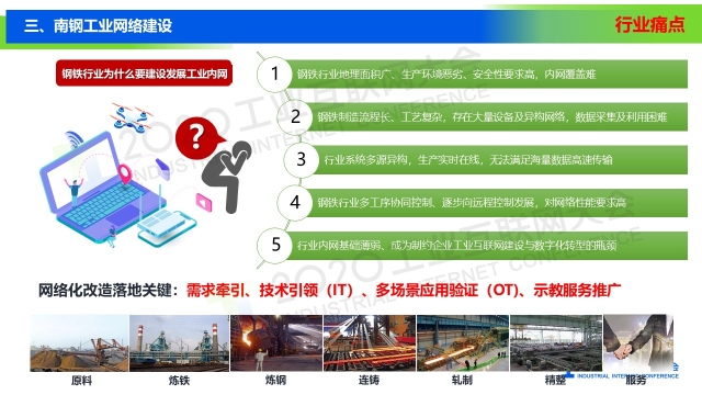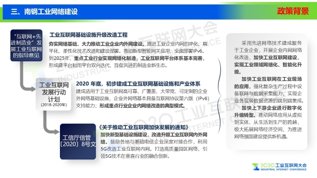 8月30日下午,在2020工業互聯網大會“工業互聯網網絡”主題論壇上,南京鋼鐵股份有限公司戰略運營部副部長汝金同以《南鋼工業網絡發展及應用》為題作演講,介紹了南京鋼鐵在工業互聯網方面的發展和應用情況。