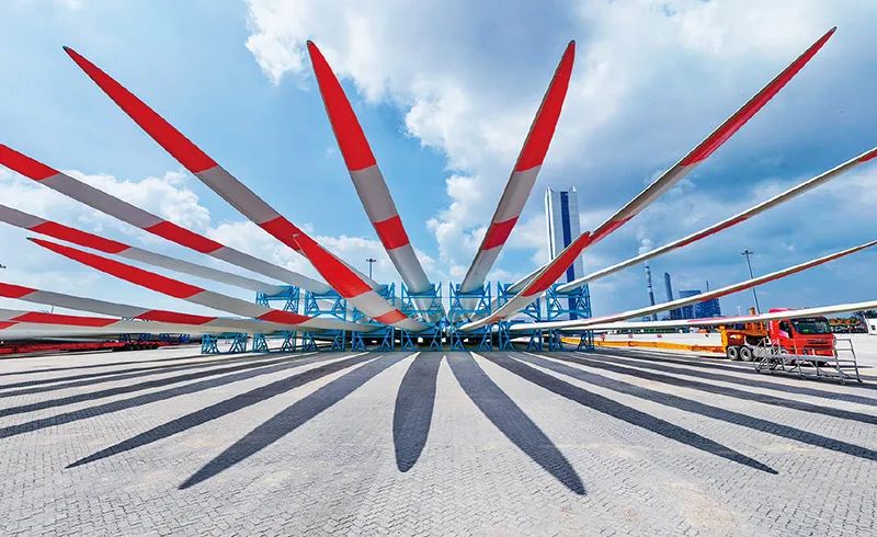 綠色低碳是新型工業化的生態底色。近年來,我國穩妥有序推進工業綠色低碳轉型,積極打造綠色產業集群,努力讓綠色成為高質量發展的鮮明底色。圖為2023年9月8日,一批風電葉片在江蘇省鹽城港射陽港區碼頭等待運輸。 新華社記者 李博/攝