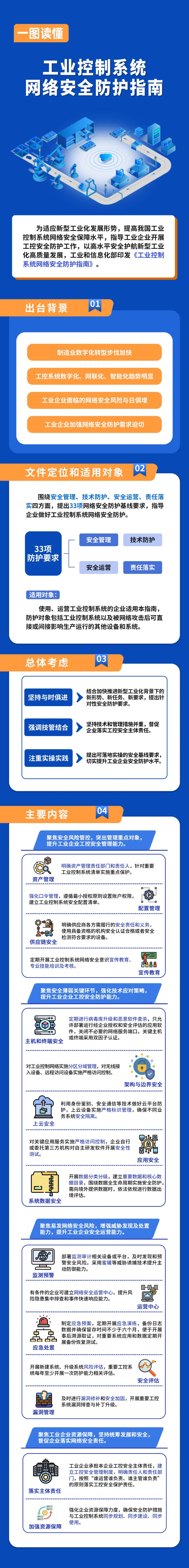 《防護(hù)指南》定位于面向工業(yè)企業(yè)做好網(wǎng)絡(luò)安全防護(hù)的指導(dǎo)性文件,堅(jiān)持統(tǒng)籌發(fā)展和安全,圍繞安全管理、技術(shù)防護(hù)、安全運(yùn)營、責(zé)任落實(shí)四方面,提出三十三項(xiàng)指導(dǎo)性安全防護(hù)基線要求,推動(dòng)解決走好新型工業(yè)化道路過程中工業(yè)控制系統(tǒng)網(wǎng)絡(luò)安全面臨的突出問題。