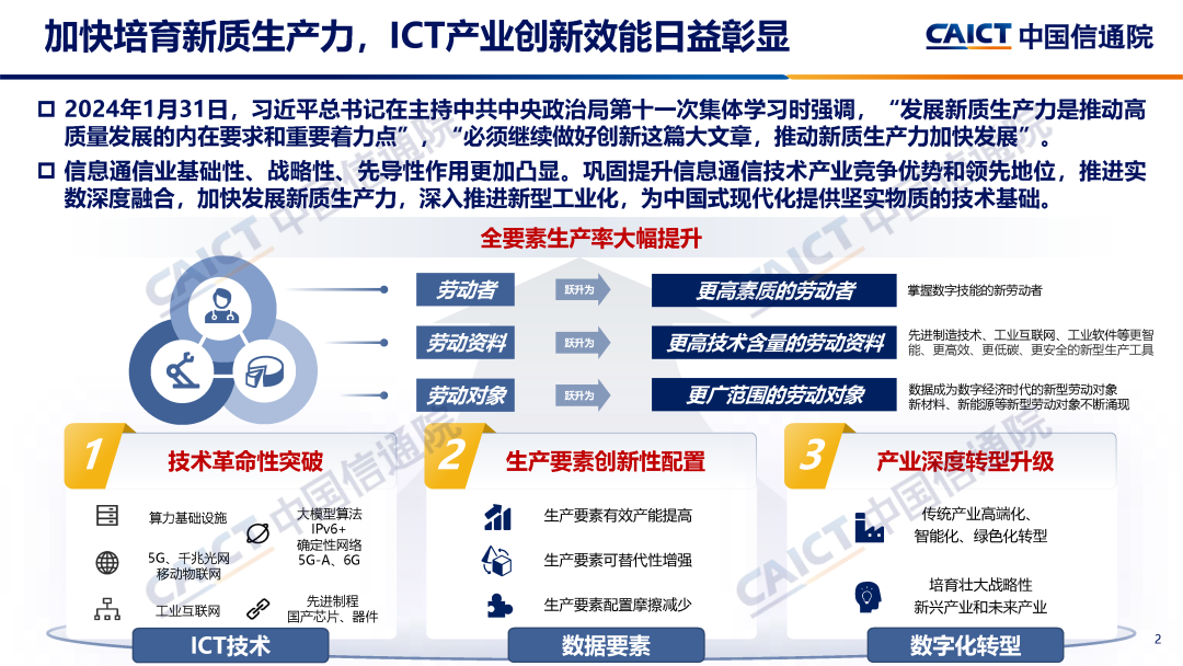 發(fā)展新質(zhì)生產(chǎn)力是推動(dòng)高質(zhì)量發(fā)展的內(nèi)在要求和重要著力點(diǎn)。ICT 產(chǎn)業(yè)通過(guò)強(qiáng)化技術(shù)創(chuàng)新突破、優(yōu)化生產(chǎn)要素配置、賦能產(chǎn)業(yè)轉(zhuǎn)型升級(jí)等,推動(dòng)顛覆性技術(shù)加速涌現(xiàn)、提高資源配置效率、帶動(dòng)傳統(tǒng)產(chǎn)業(yè)全方位系統(tǒng)性變革,為新質(zhì)生產(chǎn)力培育注入源源不竭的動(dòng)力,已成為推動(dòng)傳統(tǒng)生產(chǎn)力質(zhì)態(tài)躍遷、促進(jìn)全要素生產(chǎn)率大幅提升、實(shí)現(xiàn)高質(zhì)量發(fā)展的重要?jiǎng)恿?lái)源。