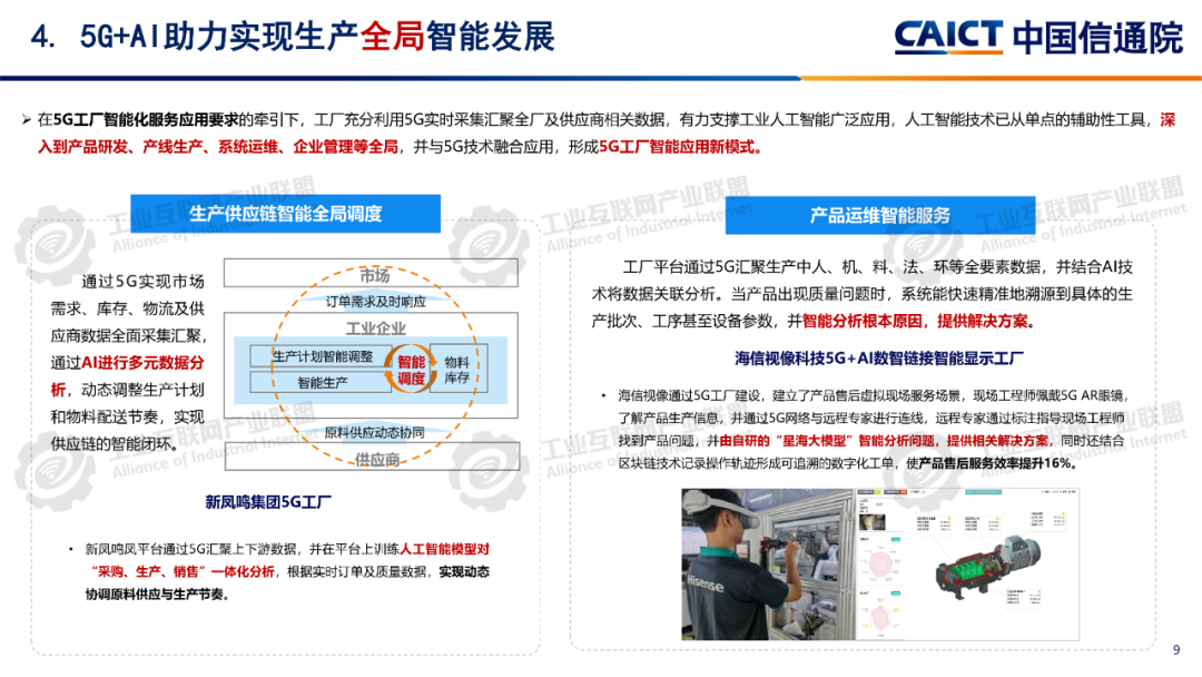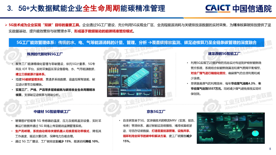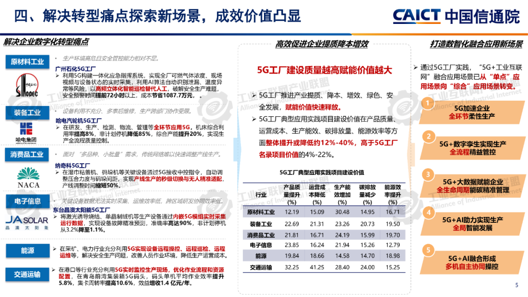 報告分析,1260個5G工廠名錄項目已覆蓋全國28個省(自治區、直轄市)、9個國民經濟門類、60個國民經濟大類。同時5G工廠作為推進工業和信息化深度融合的重要舉措,原材料工業、裝備工業、消費品工業、電子信息、能源交通等行業企業與基礎電信企業、設備及行業服務商深度合作,形成100個5G工廠典型應用實踐,各工廠平均5G網絡覆蓋率高達99.3%、現場裝備聯網率高達97.7%、無線設備5G聯網率達97%,“5G+工業互聯網”應用場景建設數量達10.5個,5G在工廠內由“單點”應用向全環節、全流程、全周期、全局、自主協同等“綜合”應用發展。一是加速企業全環節柔性生產。5G工廠推動工廠網絡無線化,通過5G全廠覆蓋,探索實現生產現場裝備云化群體控制、產線模塊化快速重構、供應鏈實時動態協同等,從而支撐企業依據市場需求,實現全環節快速調整的柔性生產方式。二是5G+數字孿生實現生產全流程精益管控。通過5G工廠系統性實施, “5G+數字孿生”已從產品研發設計、企業生產運營的可視化應用,擴展到安全生產閉環管控、廠區物流實時優化、關鍵部件精準運維等應用,實現了“虛實映射、實時監控”的工廠生產全流程精益管理。三是5G+大數據賦能企業全生命周期能碳精準管理。企業通過5G工廠建設,充分利用5G實現全廠區、全流程能源消耗與關鍵排放源數據的實時采集,構建包含碳排放監測、碳足跡核算、全鏈條碳管理等功能的能效管理體系,形成基于數據驅動的能碳精準管控模式。四是5G+AI助力實現生產全局智能發展。在5G工廠智能化服務應用要求的牽引下,工廠充分利用5G實時采集匯聚全廠及供應商相關數據,推動人工智能應用從單點輔助工具,深入到產品研發、產線生產、系統運維、企業管理等全局,形成生產供應鏈智能全局調度,產品運維智能服務等新模式。五是5G+AI融合形成多機自主協同操控。隨著5G工廠建設質量的不斷提升,5G高可靠、低時延性能不斷增強,人工智能技術的應用開發,設備遠程操控將從早期依賴人工判斷和操作的單點遠程操控,向由數據驅動的多設備自感知、自適應、自決策的智能化無人自主協同操控演進。