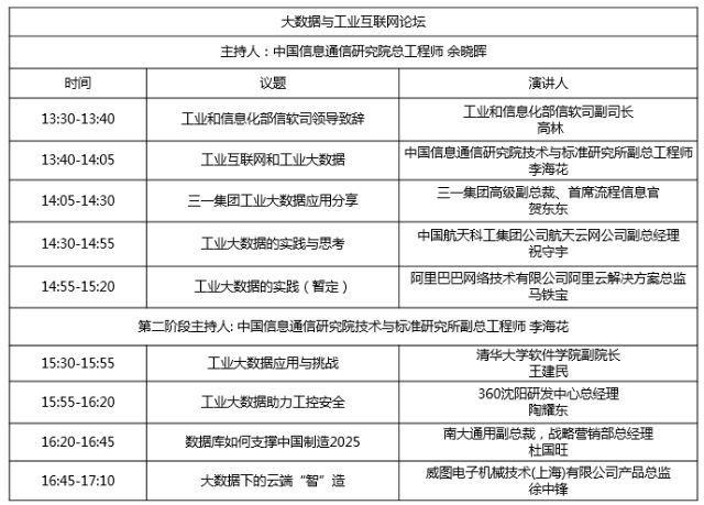 《中國制造2025》提出要從工業大國向工業強國轉變,《促進大數據發展行動綱要》也提出要從數據大國向數據強國轉變。兩大戰略相互銜接,工業+大數據,將為中國的工業轉型升級注入強大動力。為此,即將于4月27日召開的“2016大數據產業峰會”上,專門設立了“大數據與工業互聯網”論壇。論壇邀請了工業和信息化部相關領導出席論壇并致辭,解讀推動工業大數據的政策思路。屆時,來自中國信息通信研究院、三一重工、航天科工、清華大學、阿里巴巴、奇虎360等科研機構和大型工業企業和大數據企業權威專家將齊聚一堂,把握全球視野,全方位解讀“中國制造2025”,深入闡述大數據對工業的變革意義,立體剖析工業大數據核心技術與發展趨勢,分享工業大數據落地案例和最佳實踐,探討工業大數據推進中的痛點、難點和路徑。