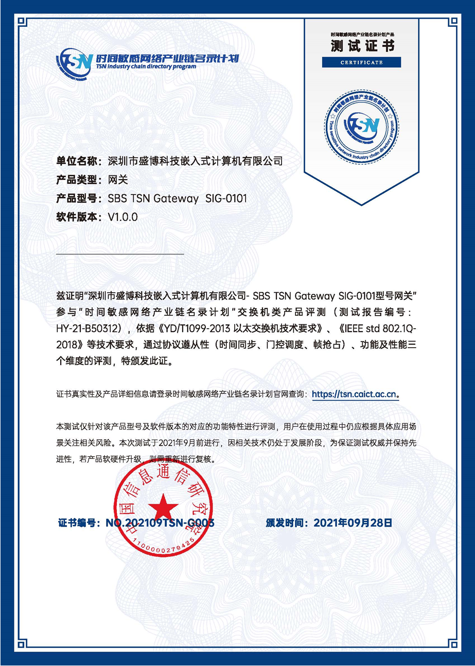 2021年9月,深圳市盛博科技嵌入式計算機有限公司研發(fā)的SIG-0101網(wǎng)關在互聯(lián)網(wǎng)與工業(yè)融合創(chuàng)新工信部重點實驗室順利通過“TSN產(chǎn)業(yè)鏈名錄計劃”產(chǎn)品測試,獲得網(wǎng)關類測試證書,成為第一批加入產(chǎn)業(yè)鏈名錄計劃的產(chǎn)品。