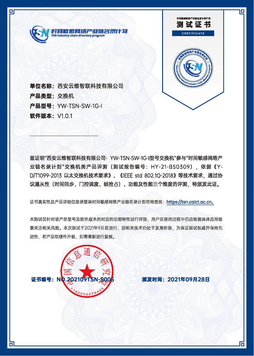 2021年9月,西安云維智聯(lián)科技有限公司研發(fā)的YW-TSN-SW-1G-I TSN交換機(jī)在互聯(lián)網(wǎng)與工業(yè)融合創(chuàng)新工信部重點(diǎn)實(shí)驗(yàn)室順利通過“TSN產(chǎn)業(yè)鏈名錄計(jì)劃”產(chǎn)品測(cè)試,獲得交換機(jī)類測(cè)試證書,成為第一批加入產(chǎn)業(yè)鏈名錄計(jì)劃的產(chǎn)品。
