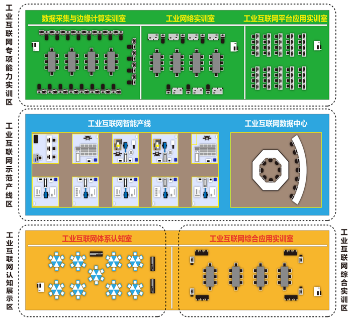 工業(yè)互聯(lián)網(wǎng)專項能力實訓區(qū)域:工業(yè)互聯(lián)網(wǎng)專項能力實訓區(qū)將規(guī)劃有工業(yè)網(wǎng)絡(luò)實訓室、數(shù)據(jù)采集與邊緣計算實訓室和工業(yè)互聯(lián)網(wǎng)平臺應用實訓室等實訓環(huán)境,基于技術(shù)領(lǐng)域視角,覆蓋了工業(yè)互聯(lián)網(wǎng)技術(shù)領(lǐng)域的感知控制層、網(wǎng)絡(luò)層、平臺層、應用層的實訓教學,能夠讓學生基本掌握工業(yè)互聯(lián)網(wǎng)平臺實施部署、運營維護、技術(shù)應用等專項技術(shù)應用能力。
