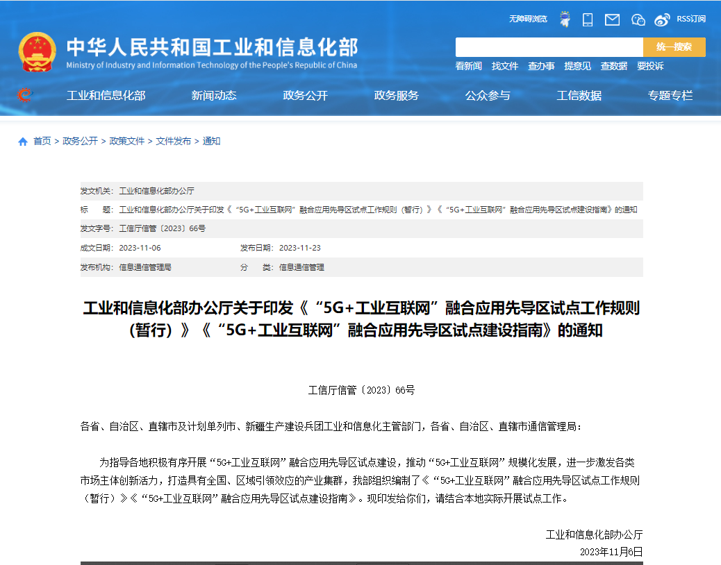 11月23日,工業(yè)和信息化部印發(fā)《“5G+工業(yè)互聯(lián)網(wǎng)”融合應(yīng)用先導(dǎo)區(qū)試點(diǎn)工作規(guī)則(暫行)》《“5G+工業(yè)互聯(lián)網(wǎng)”融合應(yīng)用先導(dǎo)區(qū)試點(diǎn)建設(shè)指南》,深入實(shí)施工業(yè)互聯(lián)網(wǎng)創(chuàng)新發(fā)展戰(zhàn)略,加強(qiáng)“5G+工業(yè)互聯(lián)網(wǎng)”融合應(yīng)用先導(dǎo)區(qū)試點(diǎn)管理工作,發(fā)揮先導(dǎo)區(qū)試點(diǎn)引領(lǐng)帶動(dòng)效應(yīng),促進(jìn)“5G+工業(yè)互聯(lián)網(wǎng)”規(guī)模化發(fā)展。