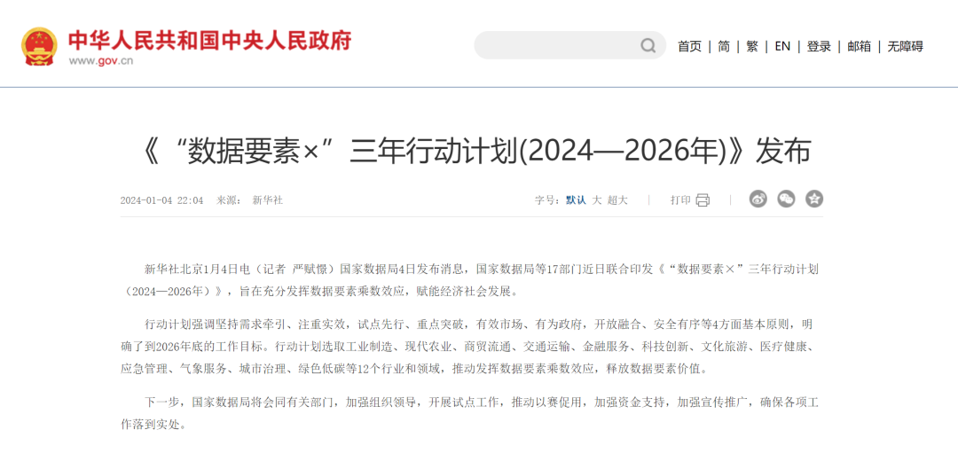 12月31日,國(guó)家數(shù)據(jù)局等17部門聯(lián)合印發(fā)《“數(shù)據(jù)要素×”三年行動(dòng)計(jì)劃(2024—2026年)》。該計(jì)劃是為深入貫徹落實(shí)習(xí)近平總書記關(guān)于發(fā)揮數(shù)據(jù)要素作用的重要指示精神和黨中央、國(guó)務(wù)院決策部署,發(fā)揮數(shù)據(jù)要素乘數(shù)效應(yīng),賦能經(jīng)濟(jì)社會(huì)發(fā)展,特制訂的行動(dòng)計(jì)劃。