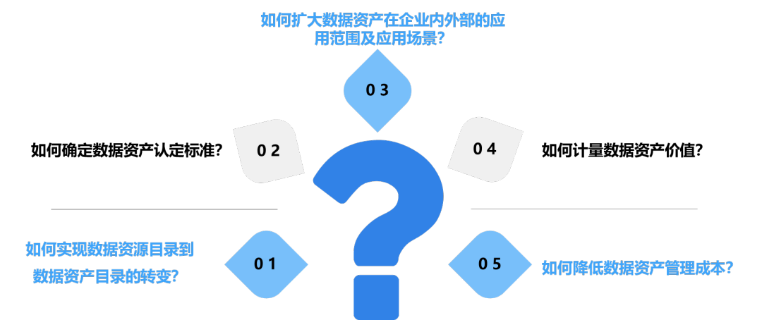 在數(shù)據(jù)資源化階段,企業(yè)普遍搭建了大數(shù)據(jù)平臺(tái),實(shí)現(xiàn)了數(shù)據(jù)的匯聚,建立了數(shù)據(jù)資源目錄。但是,在邁入數(shù)據(jù)資產(chǎn)化階段仍面臨五個(gè)主要問題。