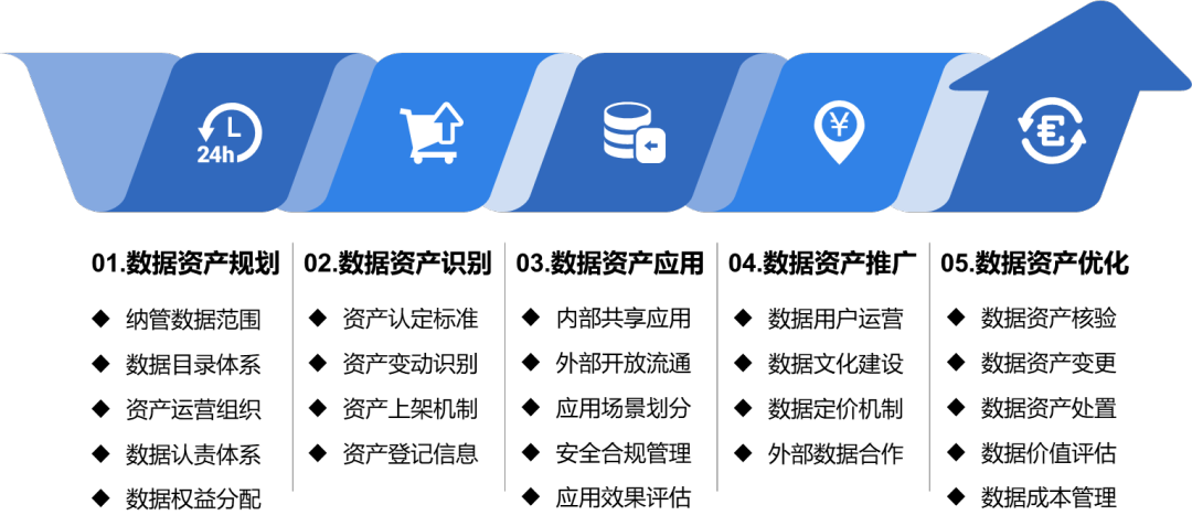 通過調(diào)研和評(píng)估觀察,我們總結(jié)出數(shù)據(jù)資產(chǎn)全運(yùn)營(yíng)“五步法”:數(shù)據(jù)資產(chǎn)規(guī)劃、數(shù)據(jù)資產(chǎn)識(shí)別、數(shù)據(jù)資產(chǎn)應(yīng)用、數(shù)據(jù)資產(chǎn)推廣、數(shù)據(jù)資產(chǎn)優(yōu)化。
