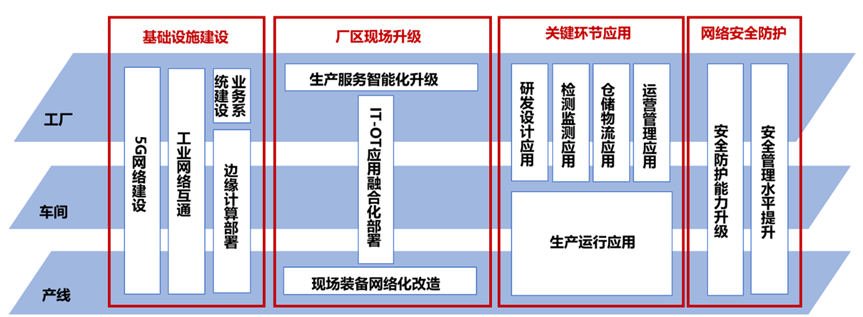 5G工廠建設(shè)內(nèi)容主要包含基礎(chǔ)設(shè)施建設(shè)、廠區(qū)現(xiàn)場升級、關(guān)鍵環(huán)節(jié)應(yīng)用、網(wǎng)絡(luò)安全防護(hù)等4個方面。