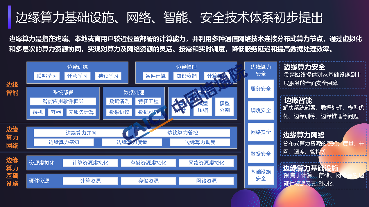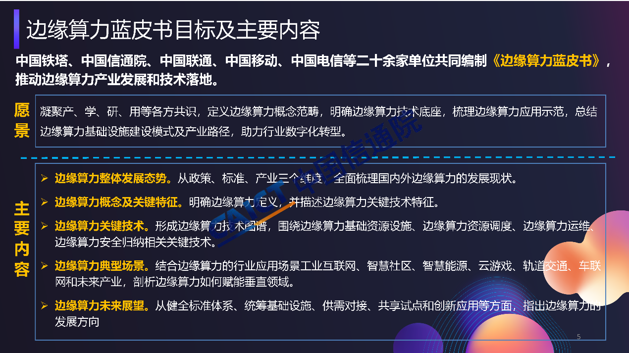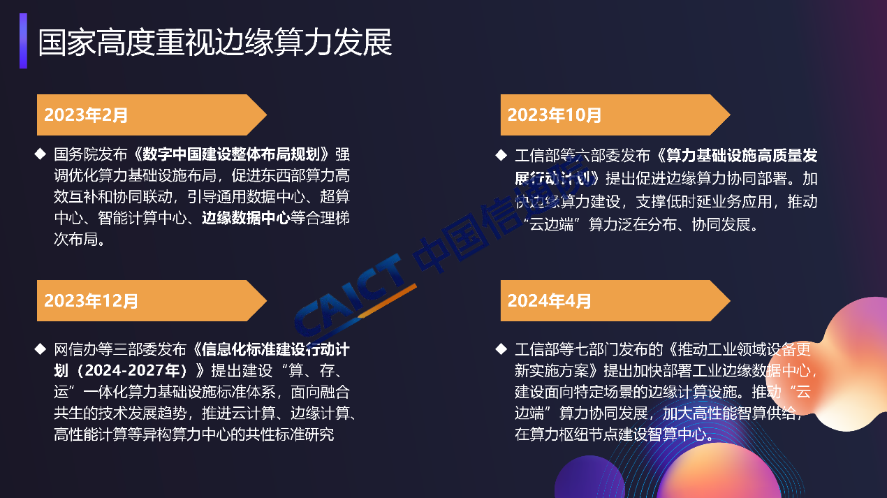 工信部等六部委聯(lián)合發(fā)布《算力基礎(chǔ)設(shè)施高質(zhì)量發(fā)展行動(dòng)計(jì)劃》,明確提出促進(jìn)邊緣算力協(xié)同部署,加快邊緣算力建設(shè),支撐工業(yè)制造、金融交易、智能電網(wǎng)、云游戲等低時(shí)延業(yè)務(wù)應(yīng)用,推動(dòng)“云邊端”算力泛在分布、協(xié)同發(fā)展。中國(guó)鐵塔、中國(guó)信通院、中國(guó)聯(lián)通、中國(guó)移動(dòng)等單位共同啟動(dòng)邊緣算力研究項(xiàng)目,并形成了《邊緣算力藍(lán)皮書》,也期待與行業(yè)內(nèi)合作伙伴共同合作,持續(xù)推動(dòng)邊緣算力技術(shù)體系構(gòu)建及產(chǎn)業(yè)生態(tài)發(fā)展。