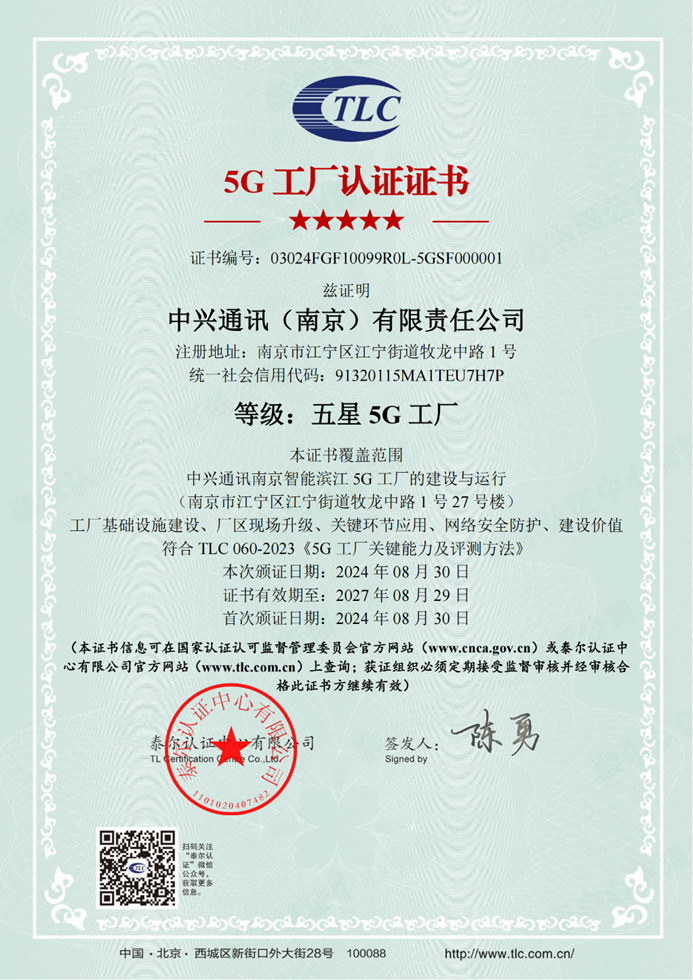值此工業(yè)和信息化部《5G全連接工廠建設指南》發(fā)布兩周年,國內首個五星5G工廠——中興通訊南京智能濱江5G工廠(以下簡稱“濱江工廠”)建設完成,通過中國信息通信研究院(簡稱“中國信通院”)泰爾認證中心認證,成為5G技術與電子設備制造業(yè)深度融合與全面應用的新標桿。