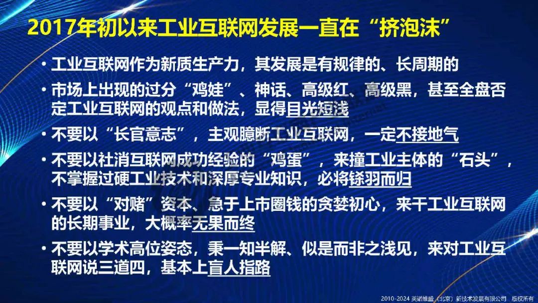 中國(guó)工業(yè)互聯(lián)網(wǎng)兼容繼承了兩化融合、企業(yè)信息化、工業(yè)自動(dòng)化、智能制造、CIMS、IPD、數(shù)字化轉(zhuǎn)型、新型工業(yè)化等多模式活動(dòng),以可持續(xù)融合創(chuàng)新方式,支撐、優(yōu)化、賦能企業(yè)發(fā)展,對(duì)推動(dòng)制造業(yè)轉(zhuǎn)型升級(jí)、提升生產(chǎn)效率、降低運(yùn)營(yíng)成本等方面具有重要意義。在過(guò)去多年發(fā)展中工業(yè)互聯(lián)網(wǎng)已經(jīng)擠出很多泡沫,即將迎來(lái)高質(zhì)量發(fā)展新時(shí)期。