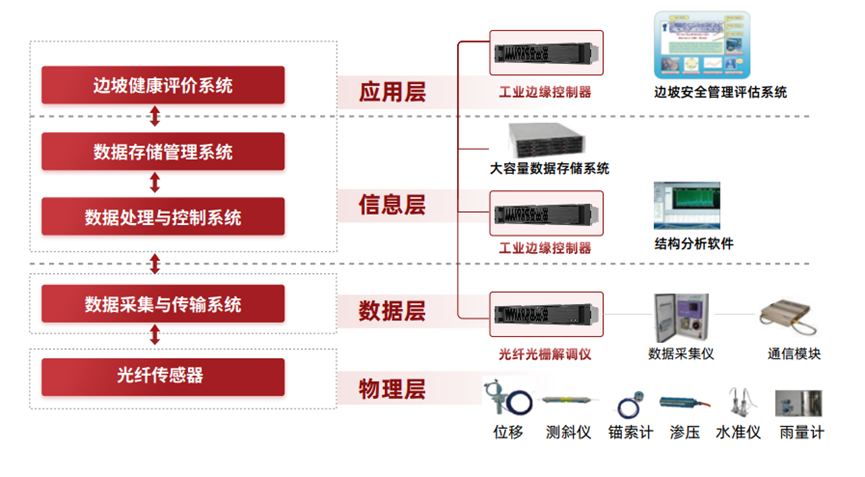在能源礦山領(lǐng)域,尾礦庫是礦山選礦廠生產(chǎn)不可缺少的設(shè)施。但由于其建設(shè)過程往往需要筑壩攔截谷口或圍地,成為了具有高勢(shì)能的人造泥石流危險(xiǎn)源,在汛期存在潰壩危險(xiǎn),易造成特大事故。為保障礦山生產(chǎn)的安全穩(wěn)定,國家重點(diǎn)黃金冶煉企業(yè)基于曙光GWR-3230H工業(yè)邊緣控制器與國產(chǎn)軟件,利用光纖光柵傳感技術(shù),打造光纖光柵解調(diào)儀,通過各類傳感器采集礦山邊坡數(shù)據(jù)。同時(shí),利用GWR-3230H工業(yè)邊緣控制器的高性能、高可靠特性,在礦山現(xiàn)場(chǎng)部署結(jié)構(gòu)分析軟件和邊坡安全管理評(píng)估系統(tǒng),從物理層、數(shù)據(jù)層、信息層和應(yīng)用層打造完整的礦山邊坡監(jiān)測(cè)系統(tǒng)。
