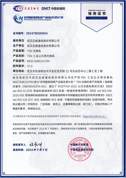 2024年8月,武漢邁威通信股份有限公司(以下簡稱邁威)研發(fā)的MISCOM8216TSN型工業(yè)以太網(wǎng)TSN交換機(jī),在互聯(lián)網(wǎng)與工業(yè)融合創(chuàng)新工信部重點(diǎn)實(shí)驗(yàn)室順利通過名錄計(jì)劃產(chǎn)品評(píng)測,獲得交換機(jī)類檢測證書。