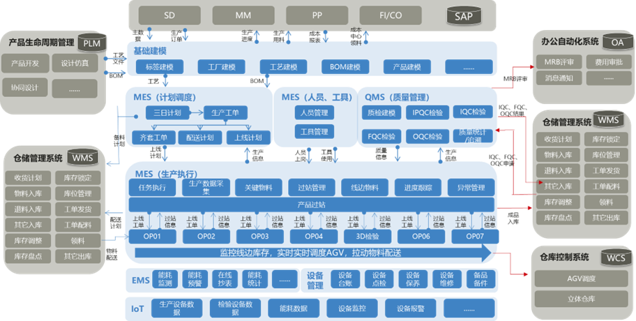 項目應用信息模型等技術打通自動化生產與運營系統,搭建統一數據采集和分析平臺,支持生產、質量、設備、能耗等數據的采集與多維度分析。項目開發的MOM平臺集成了MOM、QMS、EAM、EMS等自動化生產與運營功能,并預留統一數據接口,支持現有和正在建設的PLM、SCADA、WMS等系統集成,實現生產排程、過程管控、產品質量管理、設備維護、能源監控等的智能化,輔助企業決策,具體實施方案如圖2所示。