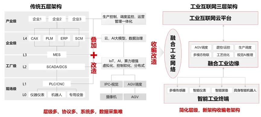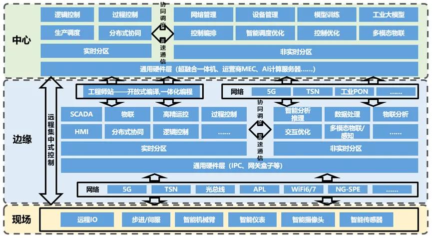 隨著ICT技術(shù)在工業(yè)領域的深度融合與廣泛應用,傳統(tǒng)工廠ISA-95生產(chǎn)體系架構(gòu)正經(jīng)歷著前所未有的深刻變革。隨著智能機器的發(fā)展和智能分析的集中,工業(yè)生產(chǎn)體系架構(gòu)進一步扁平化,通過功能疊加和收編改造,傳統(tǒng)的垂直體系將會變成水平架構(gòu),從傳統(tǒng)的ISA95的五層金字塔架構(gòu)演變成為“以控制+計算+網(wǎng)絡為中心”的云-邊-端三層體系架構(gòu)。L3和L4層的企業(yè)生產(chǎn)和管理系統(tǒng)如ERP、MES等,正逐步從傳統(tǒng)的單機系統(tǒng)架構(gòu)向云化架構(gòu)轉(zhuǎn)型,不僅實現(xiàn)了ERP、MES等關鍵應用的中心云端部署,更依托AI大模型與數(shù)據(jù)治理技術(shù)的強大支撐,催生出統(tǒng)一管理和運維的工業(yè)互聯(lián)網(wǎng)云平臺。同時L2(監(jiān)測層)系統(tǒng)也展現(xiàn)出新的發(fā)展趨勢,部分功能融合數(shù)字孿生、人工智能等技術(shù),部署至中心云端,實現(xiàn)生產(chǎn)過程的直觀呈現(xiàn)與深度洞察;另一部分則向邊緣側(cè)延伸,融合物聯(lián)、邊緣智能推理等能力,強化數(shù)據(jù)采集、分析推理等核心能力,逐漸以虛擬化、分布式部署于邊緣側(cè)。L1(控制層)功能同時也逐漸向邊側(cè)遷移,隨著軟硬件解耦合逐步發(fā)展及智能化邊緣控制成為主流方向,控制資源池化并靈活部署于通用計算架構(gòu)之上。這一變革不僅提升了系統(tǒng)的靈活性與可擴展性,更在多個工業(yè)場景中展現(xiàn)出現(xiàn)場應用價值。L0(工業(yè)裝備層)裝備的數(shù)字化與終端的智能化進程加速推進,向終端側(cè)遷移,形成智能終端。多模態(tài)傳感器、智能儀表、智能裝備、具身機器人等關鍵技術(shù)的研發(fā)取得顯著進展,使得數(shù)據(jù)收集、處理與存儲的門檻顯著降低。同時,小型化、輕量級的實時操作系統(tǒng)與IP協(xié)議棧應運而生,以極低的資源占用率與能耗,實現(xiàn)了對工業(yè)終端的高效管理與控制,為工業(yè)互聯(lián)網(wǎng)的廣泛部署奠定了堅實基礎。