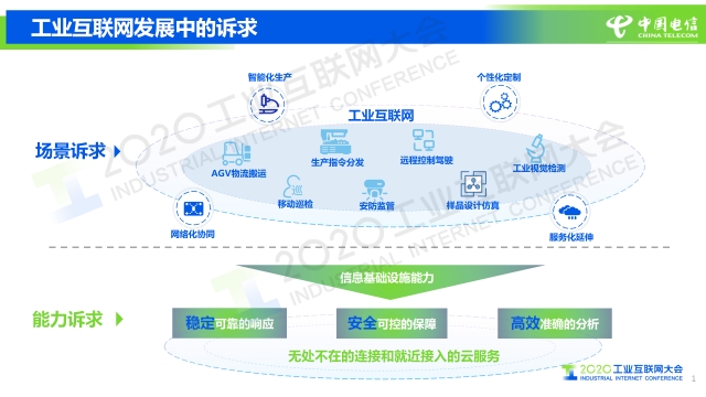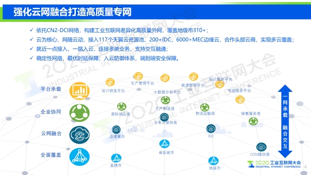 “業界普遍認為,新基建,需要三大基礎設施,即,“5G+ 工業互聯網”的網絡設施、“人工智能+云計算”的新技術設施、“大數據技術+數據中心”的算力設施。中國電信將以云網融合為基,發揮自身優勢,不斷完善上述三大基礎設施建設,借助5G等多連接技術、隨選的混合多云、云間高速網絡等形成5G+NBIOT+MEC+ABCD+工業PON+CN2的云網基礎設施底座,為工業互聯網提供綜合的、定制化的云網融合服務。同時,中國電信將持續聚合國內外工業互聯網平臺和應用,與各界開展合作。”
