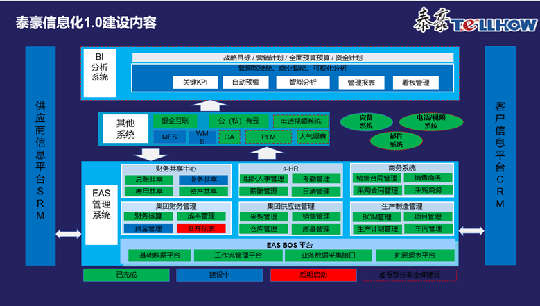 泰豪數字化轉型也是隨著企業發展的歷程而不斷發展。第一次和金蝶攜手是在2001年,隨著企業的發展,我們也是不斷在選擇更合適泰豪的解決方案。2016年隨著泰豪二次創業的目標,我們再次和金蝶做了數字化轉型1.0的建設,將集團財務、HR、業務管理一體化進行了全方位合作。最近兩年我們與金蝶在進行數字化轉型2.0的設計。1.0目標還是比較基礎,就是做人財物、全線上、業財一體、人才共享。2.0希望做到集團戰略管控,實現數字化業務的賦能,實時洞察經營管理風險,降低運營管理成本。
