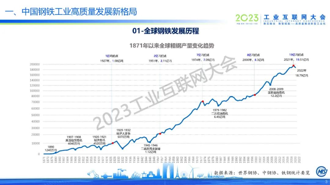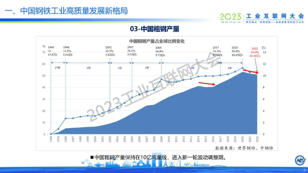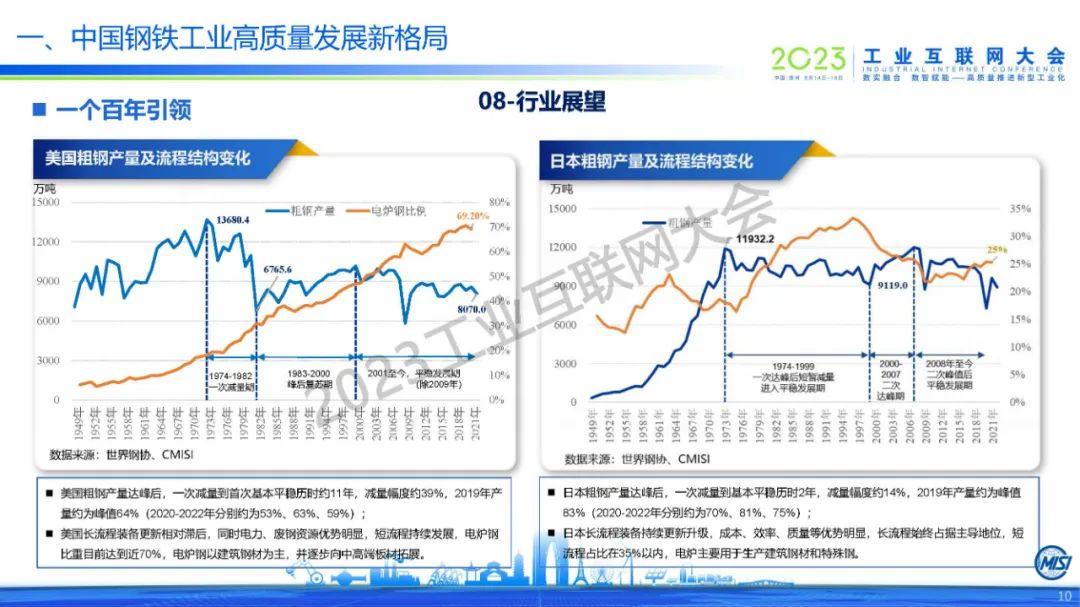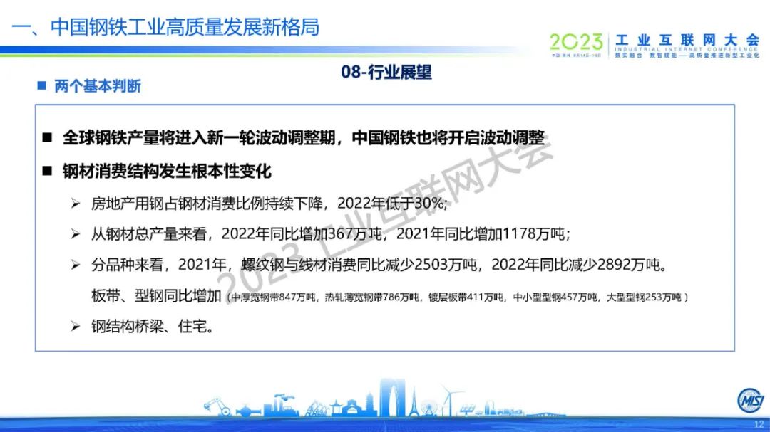 張龍強表示,全球鋼鐵產量將進入新一輪波動調整期,中國鋼鐵也將開啟新的調整。目前中國已經邁入鋼鐵強國的序列,鋼材消費結構發生根本性變化。他指出數字化智能化已覆蓋中國鋼鐵、礦山、原料場、煉鐵、煉鋼、軋鋼、能源、廢鋼、物流等全產業鏈,中國鋼鐵工業勞動生產率和資源利用效率持續提升,實現了節能減排、降本增效,推進了安全生產和勞動環境改善。