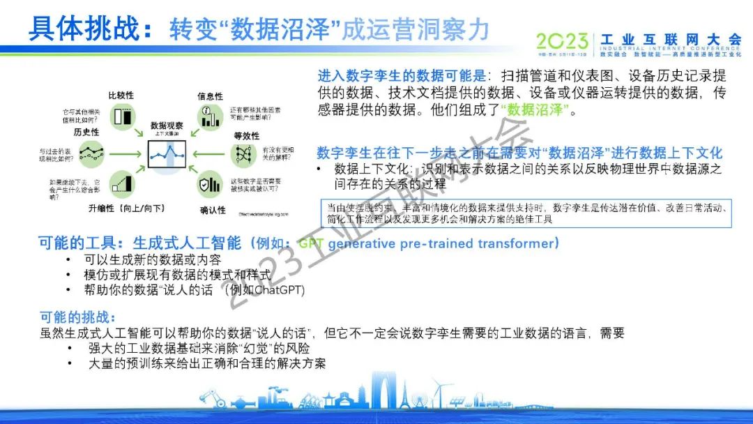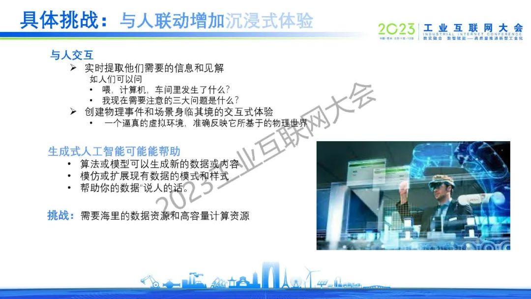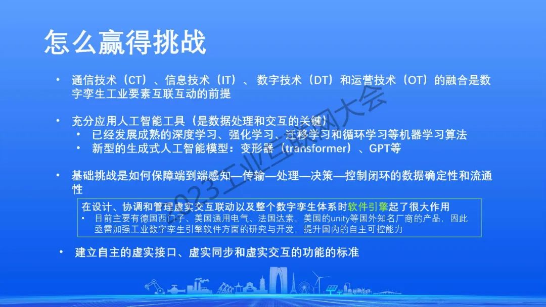 沈八中表示通信技術(shù)、信息技術(shù)、 數(shù)字技術(shù)(數(shù)據(jù)可視化技術(shù))和運營技術(shù)的融合是數(shù)字孿生工業(yè)要素互聯(lián)互動的前提。人工智能工具是數(shù)字孿生中數(shù)據(jù)處理和交互的關(guān)鍵。當今人工智能除了已經(jīng)發(fā)展成熟的深度學習、強化學習、遷移學習和循環(huán)學習等機器學習算法外,新型的以全概率和大型模型為基礎的生成式人工智能將起到?jīng)Q定性的作用。為讓全國乃至全球數(shù)字孿生技術(shù)的共同發(fā)展,我們應考慮建立自主的虛實接口、虛實同步和虛實交互的功能的標準。