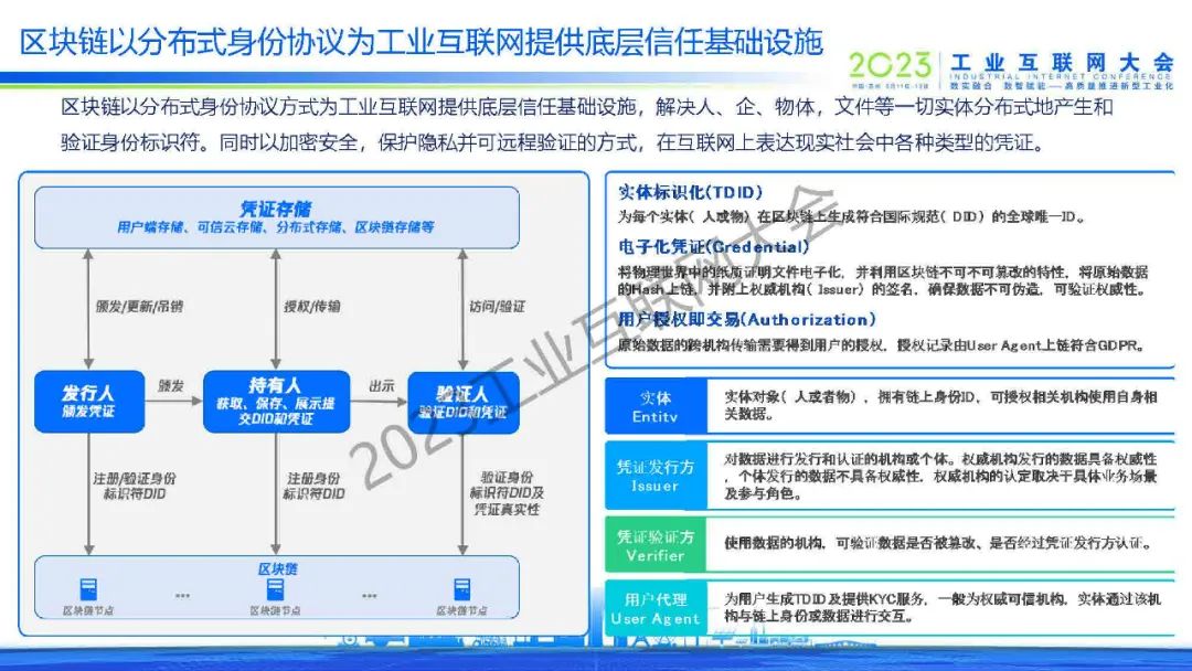 敖萌表示,區(qū)塊鏈以分布式身份協(xié)議方式為工業(yè)互聯(lián)網(wǎng)提供底層信任基礎(chǔ)設(shè)施,解決人、企、物體,文件等一切實體分布式地產(chǎn)生和驗證身份標(biāo)識符。同時以加密安全,保護(hù)隱私并可遠(yuǎn)程驗證的方式,在互聯(lián)網(wǎng)上表達(dá)現(xiàn)實社會中各種類型的憑證。