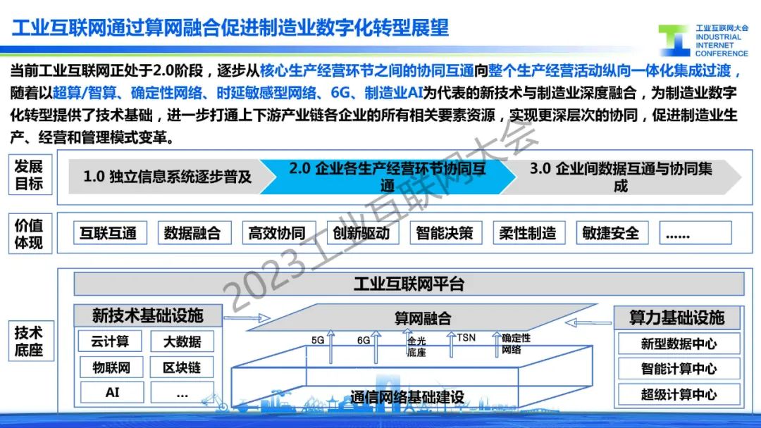 戴中華指出,當(dāng)前工業(yè)互聯(lián)網(wǎng)正處于2.0階段,逐步從核心生產(chǎn)經(jīng)營環(huán)節(jié)之間的協(xié)同互通向整個(gè)生產(chǎn)經(jīng)營活動(dòng)縱向一體化集成過渡, 隨著以超算/智算、確定性網(wǎng)絡(luò)、時(shí)延敏感型網(wǎng)絡(luò)、6G、制造業(yè)AI為代表的新技術(shù)與制造業(yè)深度融合,為制造業(yè)數(shù)字 化轉(zhuǎn)型提供了技術(shù)基礎(chǔ),進(jìn)一步打通上下游產(chǎn)業(yè)鏈各企業(yè)的所有相關(guān)要素資源,實(shí)現(xiàn)更深層次的協(xié)同,促進(jìn)制造業(yè)生 產(chǎn)、經(jīng)營和管理模式變革。