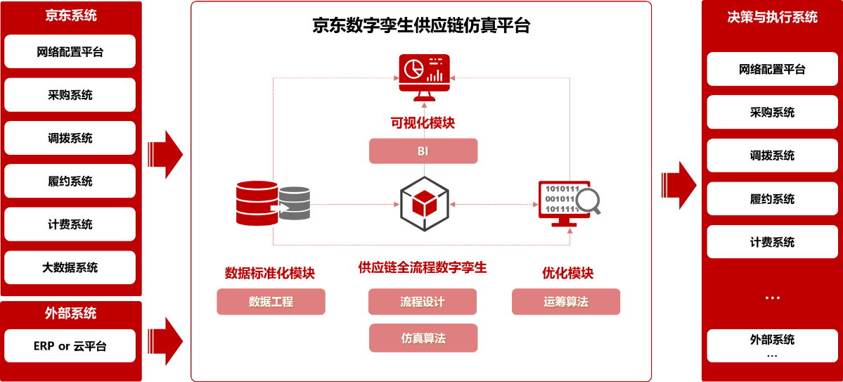 京東數(shù)字孿生供應(yīng)鏈平臺是在業(yè)務(wù)需求下應(yīng)需而生,由于一體化供應(yīng)鏈規(guī)劃覆蓋網(wǎng)絡(luò)及策略的綜合調(diào)整,單一環(huán)節(jié)的仿真技術(shù)無法支持業(yè)務(wù)的綜合規(guī)劃需求。平臺對不同環(huán)節(jié)的仿真算法進行集成,基于真實業(yè)務(wù)數(shù)據(jù),突破式的實現(xiàn)了長鏈條下的供應(yīng)鏈端到端全流程仿真建模能力,可支持業(yè)務(wù)對過程中的流量流向數(shù)據(jù)及結(jié)果指標進行多視角分析,使業(yè)務(wù)能夠?qū)Χ喾N假設(shè)進行預(yù)研,在決策實施前就可以提前了解其可能帶來的影響,幫助我們盡可能規(guī)避風(fēng)險,選擇最優(yōu)的策略組合進行實施。