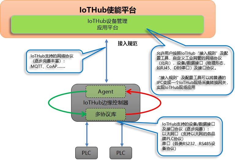 IoTHub邊緣控制器是IT和OT之間的物理接口,實(shí)現(xiàn)工業(yè)互聯(lián)網(wǎng)應(yīng)用的南向與北向“互聯(lián)互通”。IoTHub邊緣控制器產(chǎn)品(圖3)包括IoTHub Agent邊緣采集網(wǎng)關(guān)、工控機(jī)等。結(jié)合不同的采集、處理及存儲(chǔ)需求,邊緣控制涵蓋ARM架構(gòu)、X86架構(gòu)的處理器,支持Linux及Windows操作系統(tǒng),結(jié)合工業(yè)現(xiàn)場典型的數(shù)據(jù)接口類型,典型的南向物理接口包括RJ45(LAN)、RS232、RS485、GPIO等接口,支持主流的PLC協(xié)議及數(shù)控協(xié)議,用于連接邊緣層設(shè)備。北向提供RJ45(WAN)、4G、WiFi等網(wǎng)絡(luò)接口,支持標(biāo)準(zhǔn)TCP/IP、MQTT等網(wǎng)絡(luò)協(xié)議,用于連接工業(yè)互聯(lián)網(wǎng)平臺(tái)或工業(yè)互聯(lián)網(wǎng)賦能平臺(tái)(圖4),完成IT與OT的物理融合。