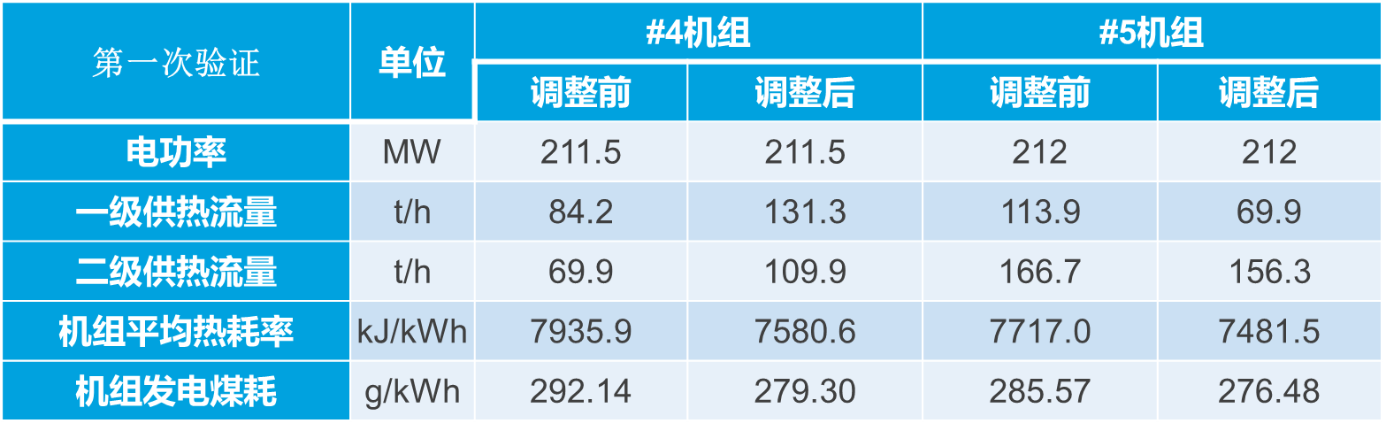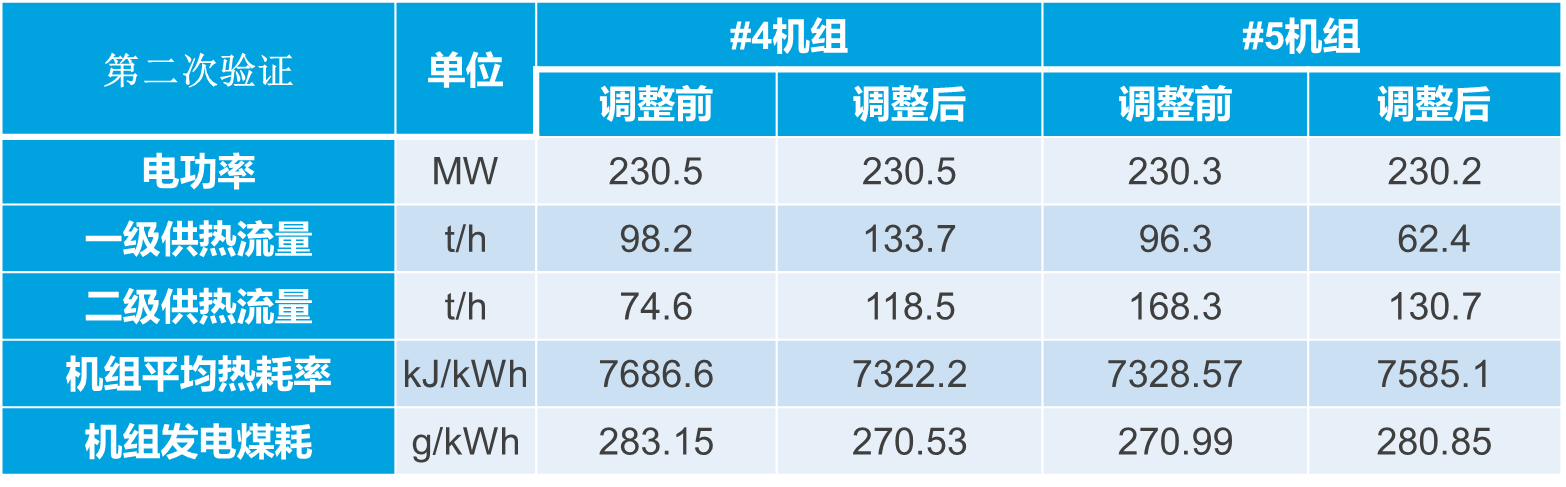 實時負荷分配模塊2019年8月22日在化工園的#4和#5機組進行了實時負荷分配的試驗,分別進行了單機電負荷210MW、230MW下供熱負荷轉移的實時負荷優化效果驗證。試驗效果如下表所示,結果表明:扣除供熱變化因素,優化節能量折合標煤1.8t/h,210MW下供熱負荷轉移的試驗結果,優化后的約合全廠發電煤耗下降4.25g/kWh,230MW下供熱負荷轉移的試驗結果表明,優化后的約合全廠發電煤耗下降2.05g/kWh。實際節能量根據負荷、工況不同,較平均分配有1~5g/kWh的下降。