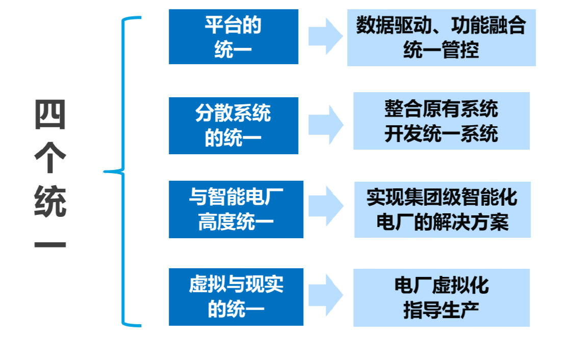 5、整合現有資源,形成統一互聯網平臺,完成數據驅動、功能融合的統一管控、整合原有系統并開發統一系統、實現集團級智能化電廠的解決方案、電廠虛擬化指導生產。