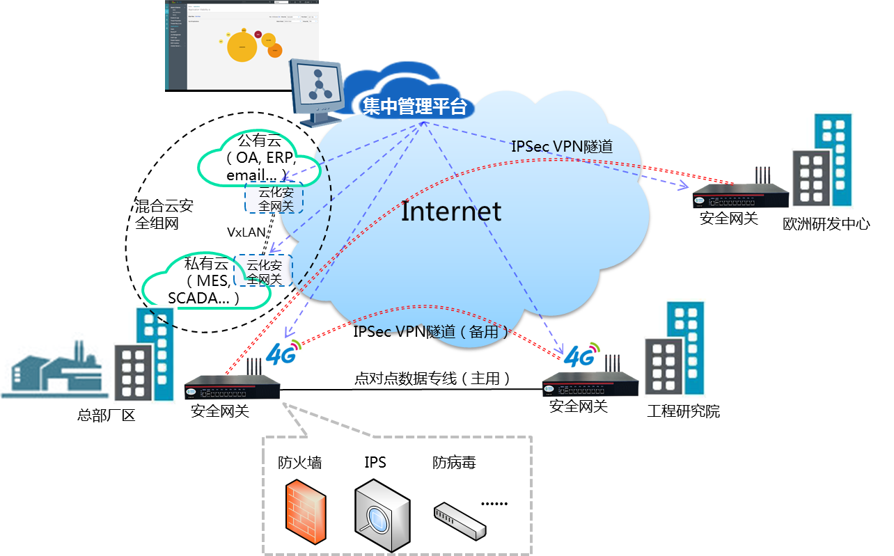 在該企業總部廠區與工程研究院之間各部署一臺安全網關,通過安全網關在兩點間部署主備兩條數據鏈路進行數據傳輸,主用鏈路為一條點對點數據專線,該鏈路為企業專用,與Internet物理隔離。備用鏈路為使用安全網關建立的一條加密的IPSec VPN隧道,通過TD-LTE無線網絡進行數據傳輸。基于IPSec的加密功能,可以保證數據的端到端安全傳輸。安全網關支持TD-LTE通信功能,在不額外增加物理鏈路的情況下,快速完成備用鏈路的部署。在主鏈路故障時,業務會自動切換至TD-LTE鏈路。