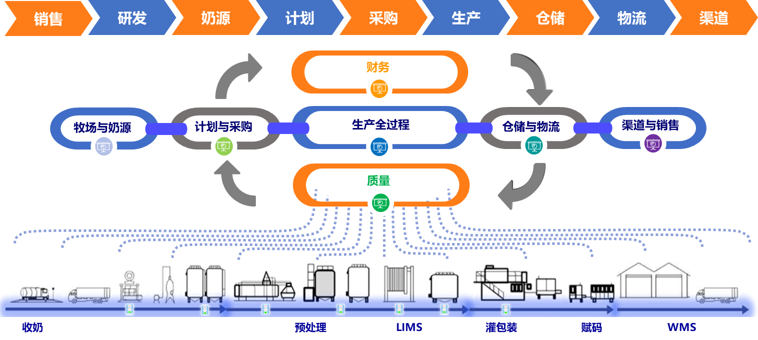 在現有局部自動化和智能化的基礎上,打破信息孤島,實現管理業務橫向互聯,制造業務縱向集成,數據信息上下互通,通過建設現代化乳制品智能工廠(先試點、后推廣),實現生產過程透明化、質量管控數字化、成本控制精細化管理,打造乳品行業智能制造新模式工廠,進而推動行業的整體建設。
