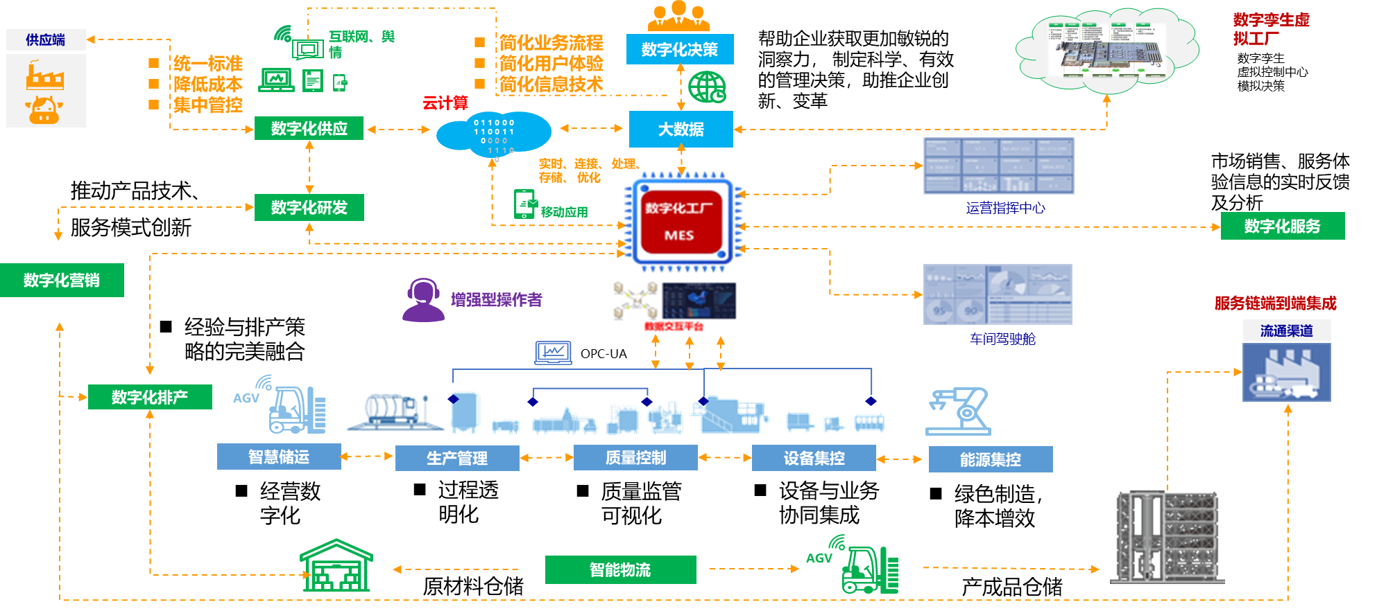 以數字化工廠為核心,大數據與互聯互通為基礎,將訂單需求與物料供應、生產制造、倉儲物流、市場分銷有機整合,形成供應鏈管理數據生態圈,實現有效食品安全治理。采用先進的物聯網、大數據、人工智能等技術,對生產執行做到狀態感知、實時分析、自動決策、精準執行,讓生產更高效、質量更安全、過程更可靠、成本更精準、管理更便捷,從而實現透明化生產、數據化管理、一鍵化追溯的數字化工廠。