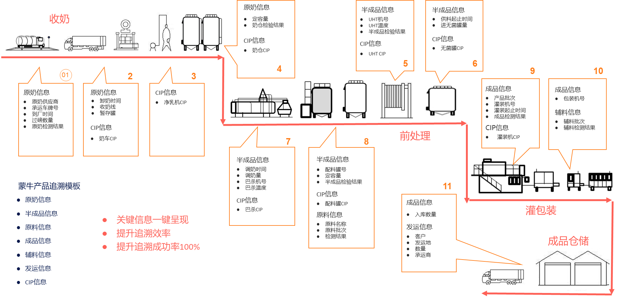 通過對全產業鏈管理實現原輔料驗收、生產過程管理、成品儲運的信息標識和全程網狀信息追溯。例如對生奶、原輔料、轉序樣品、成品等檢驗結果進行自動化采集,并將檢驗信息數字化、標準化,滿足追溯管理需求。系統可以將追溯時間從一次2小時提升到10秒鐘。