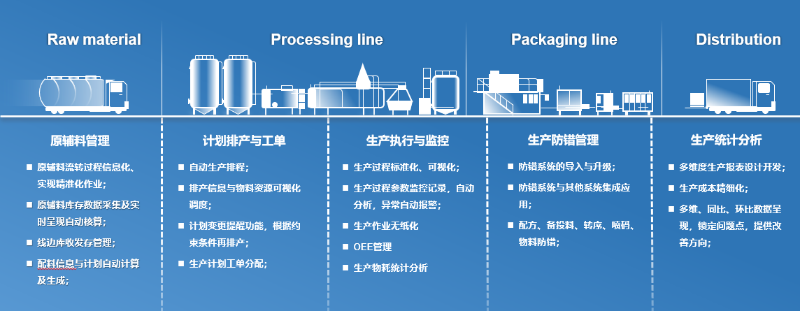 在生產執行單位管理場景中,具備原輔料管理、計劃排產、生產執行與監控、生產防錯管理,以及生產統計分析等功能。